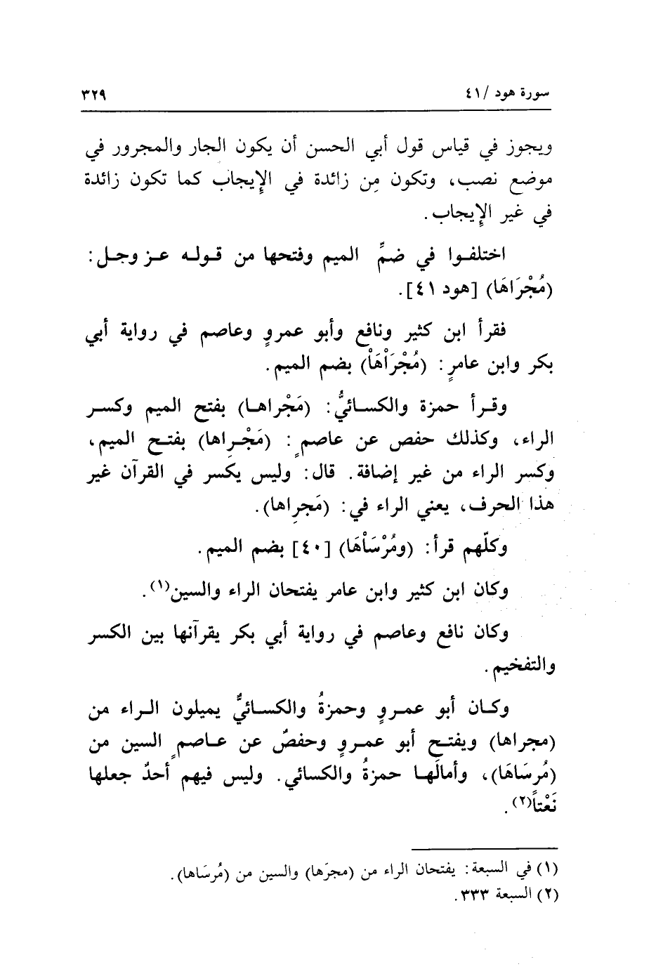 وكان أبو عمرو وحمزة والكسائيّ يميلون الراء من مجراها ويفتح أبو عمرو وحفص عن عاصم السين من مرساها، وأمالها حمزة والكسائي. وليس فيهم أحد جعلها نعتا «2».