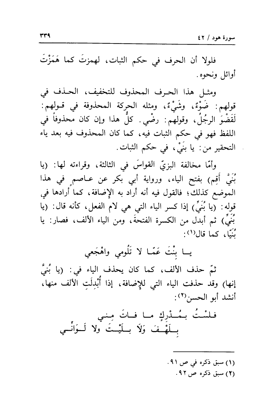 يا بنت عمّا لا تلومي واهجعي ثمّ حذف الألف، كما كان يحذف الياء في: يا بني إنها وقد حذفت الياء التي للإضافة، إذا أبدلت الألف منها، أنشد أبو الحسن «2»: