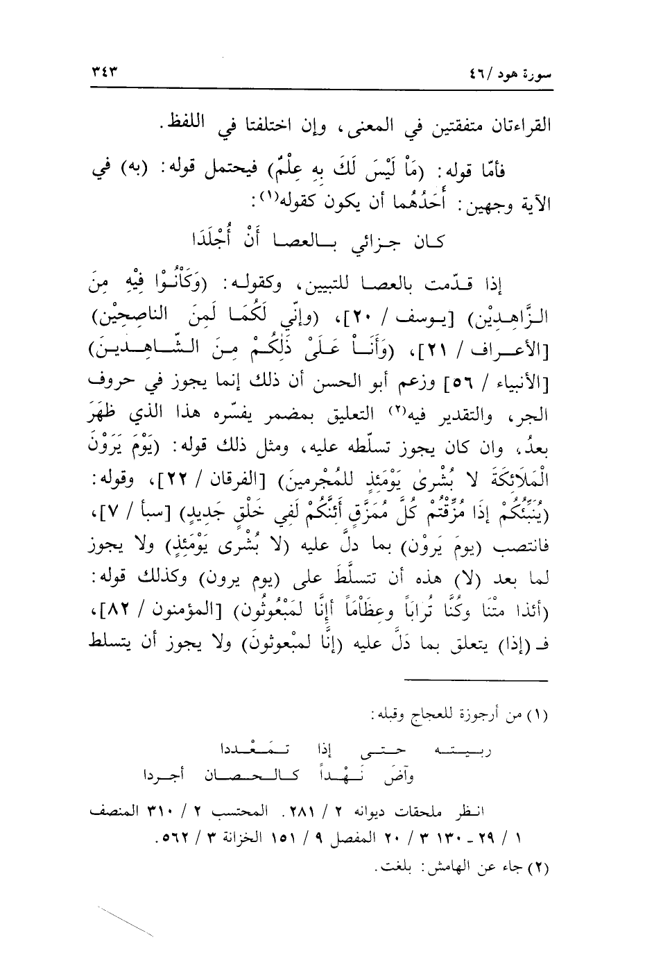 كان جزائي بالعصا أن أجلدا إذا قدّمت بالعصا للتبيين، وكقوله: وكانوا فيه من الزاهدين [يوسف/ 20]، وإني لكما لمن الناصحين [الأعراف/ 21]، وأنا على ذلكم من الشاهدين [الأنبياء/ 56] وزعم أبو الحسن أن ذلك إنما يجوز في حروف الجر، والتقدير فيه «2» التعليق بمضمر يفسّره هذا الذي ظهر بعد، وان كان يجوز تسلّطه عليه، ومثل ذلك قوله: يوم يرون الملائكة لا بشرى يومئذ للمجرمين [الفرقان/ 22]، وقوله: