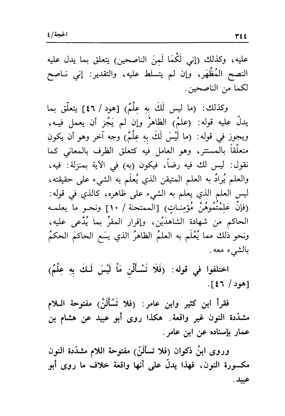 وكذلك: ما ليس لك به علم [هود/ 46] يتعلّق بما يدلّ عليه قوله: علم الظاهر وإن لم يجز أن يعمل فيه، ويجوز في قوله: ما ليس لك به علم وجه آخر وهو أن يكون متعلّقا بالمستتر، وهو العامل فيه كتعلق الظرف بالمعاني كما نقول: ليس لك فيه رضا، فيكون به* في الآية بمنزلة: فيه، والعلم يراد به العلم المتيقن الذي يعلم به الشيء على حقيقته، ليس العلم الذي يعلم به الشيء على ظاهره، كالذي في قوله:
