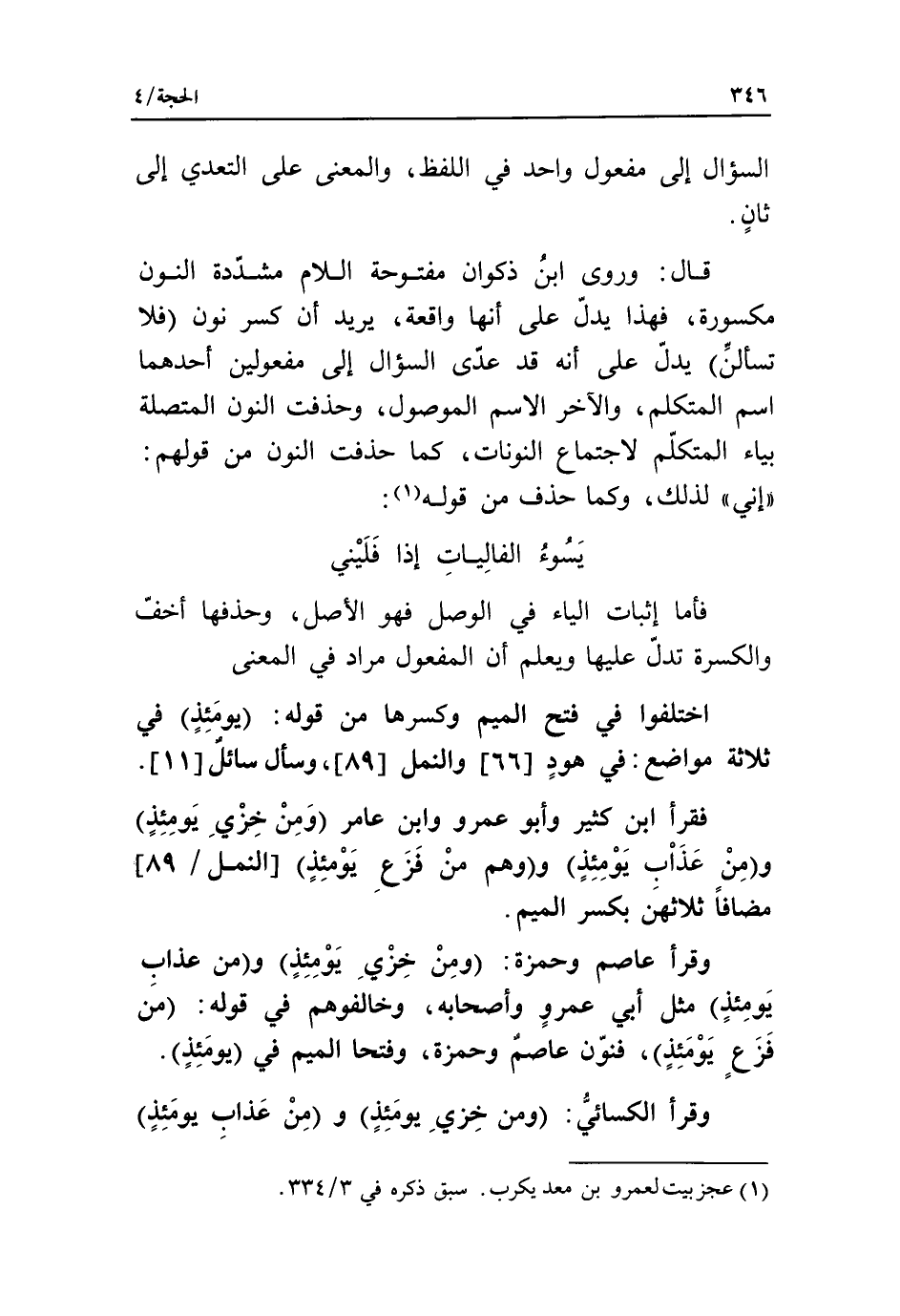 اختلفوا في فتح الميم وكسرها من قوله: يومئذ في ثلاثة مواضع: في هود [66] والنمل [89]، وسأل سائل [11].