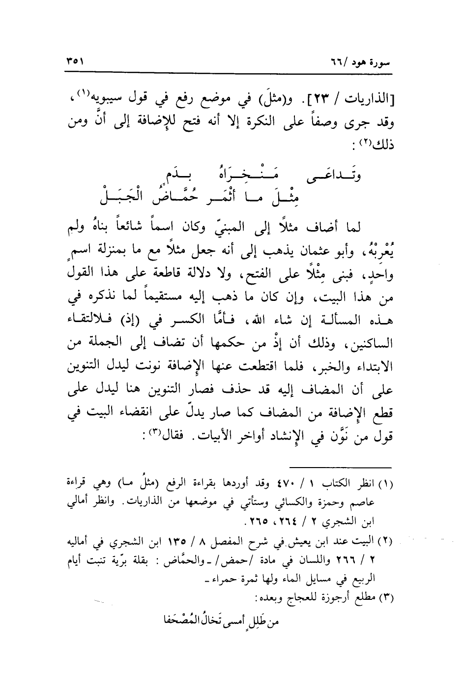 (2) البيت عند ابن يعيش في شرح المفصل 8/ 135 ابن الشجري في أماليه 2/ 266 واللسان في مادة/ حمض/- والحمّاض: بقلة برّية تنبت أيام الربيع في مسايل الماء ولها ثمرة حمراء-