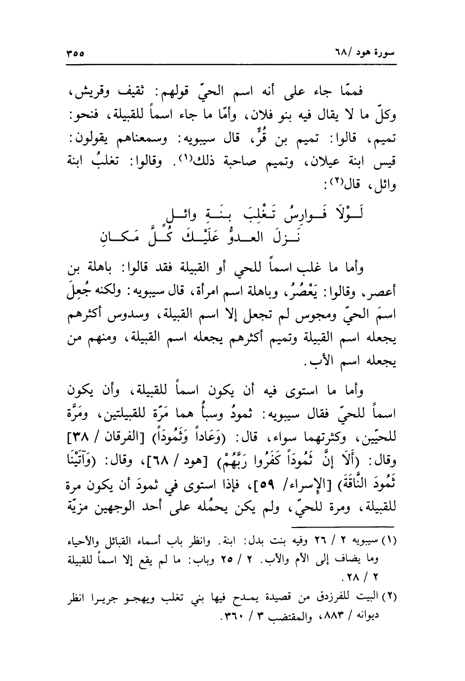 وأما ما استوى فيه أن يكون اسما للقبيلة، وأن يكون اسما للحيّ فقال سيبويه: ثمود وسبأ هما مرّة للقبيلتين، ومرّة للحيّين، وكثرتهما سواء، قال: وعادا وثمودا [الفرقان/ 38] وقال: ألا إن ثمودا كفروا ربهم [هود/ 68]، وقال: وآتينا ثمود الناقة [الإسراء/ 59]، فإذا استوى في ثمود أن يكون مرة للقبيلة، ومرة للحيّ، ولم يكن يحمله على أحد الوجهين مزيّة