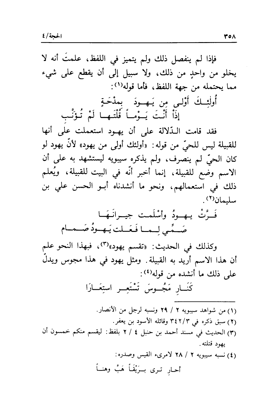 فقد قامت الدّلالة على أن يهود استعملت على أنها للقبيلة ليس للحيّ من قوله: «أولئك أولى من يهود» لأنّ يهود لو كان الحيّ لم ينصرف، ولم يذكره سيبويه ليستشهد به على أن الاسم وضع للقبيلة، إنما أخبر أنّه في البيت للقبيلة، ويعلم ذلك في استعمالهم، ونحو ما أنشدناه أبو الحسن علي بن سليمان «2».
