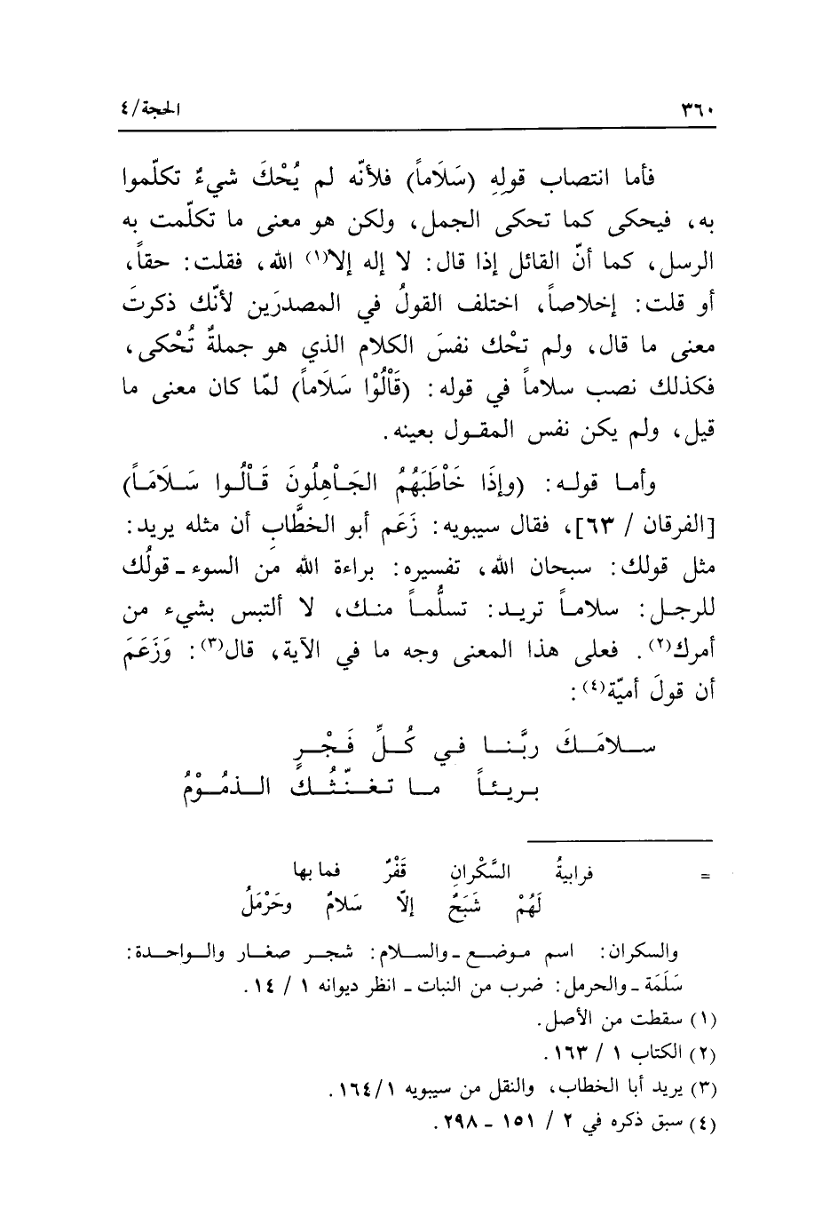 وأما قوله: وإذا خاطبهم الجاهلون قالوا سلاما [الفرقان/ 63]، فقال سيبويه: زعم أبو الخطّاب أن مثله يريد: