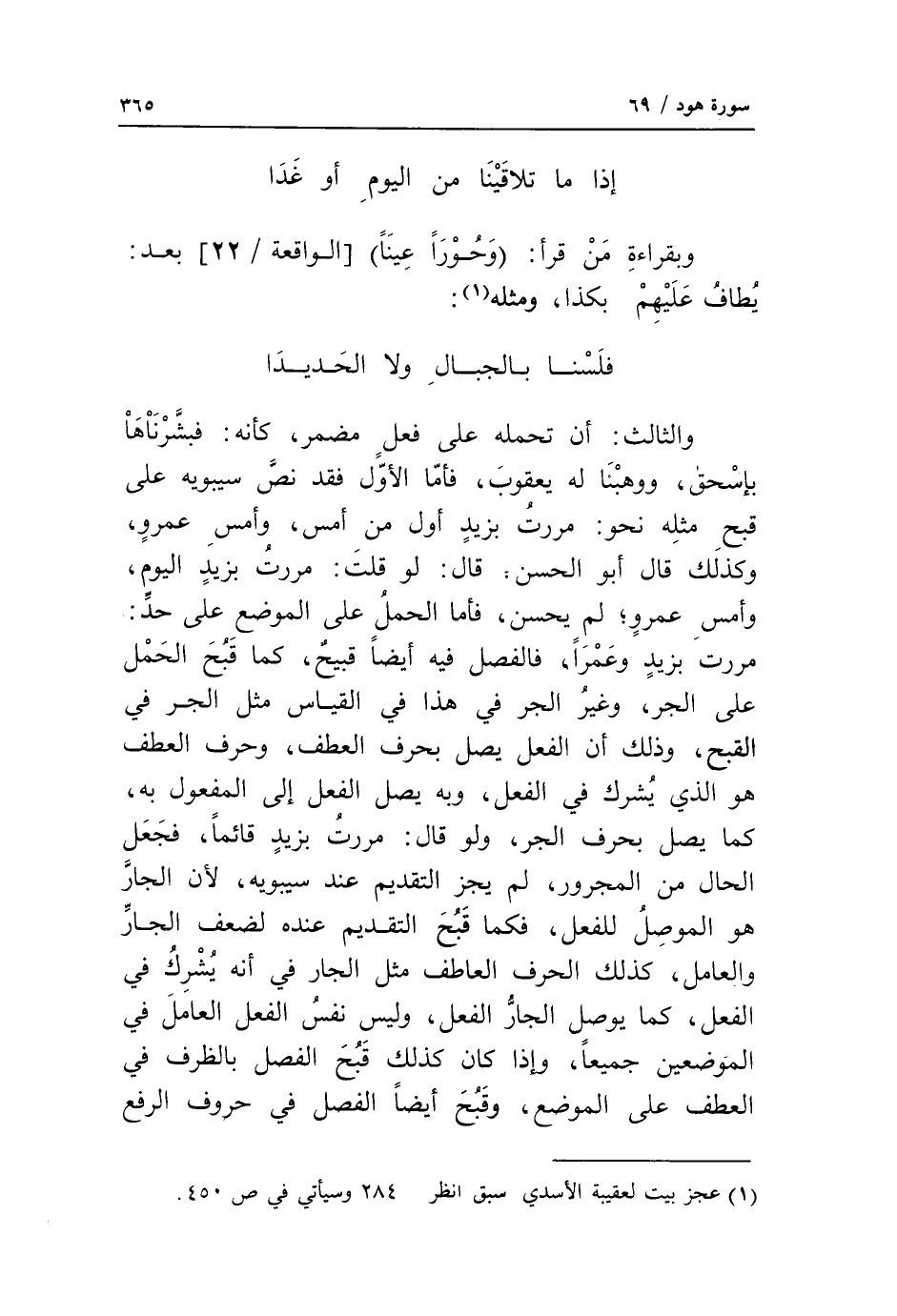 فلسنا بالجبال ولا الحديدا والثالث: أن تحمله على فعل مضمر، كأنه: فبشّرناها بإسحاق، ووهبنا له يعقوب، فأمّا الأوّل فقد نصّ سيبويه على قبح مثله نحو: مررت بزيد أول من أمس، وأمس عمرو، وكذلك قال أبو الحسن: قال: لو قلت: مررت بزيد اليوم، وأمس عمرو؛ لم يحسن، فأما الحمل على الموضع على حدّ:
