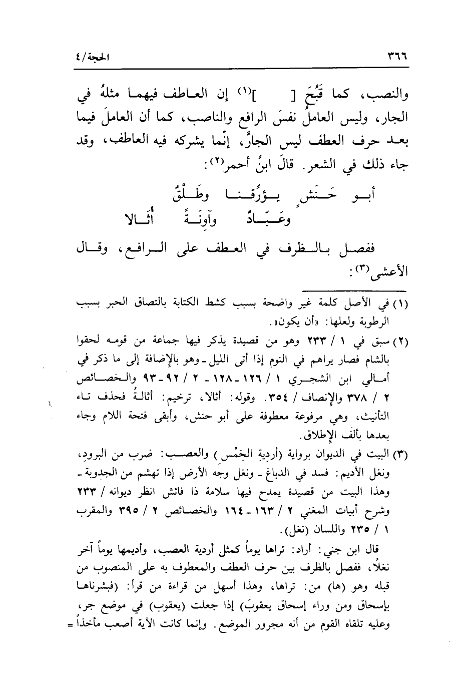 والنصب، كما قبح [] «1» إن العاطف فيهما مثله في الجار، وليس العامل نفس الرافع والناصب، كما أن العامل فيما بعد حرف العطف ليس الجارّ، إنّما يشركه فيه العاطف، وقد جاء ذلك في الشعر. قال ابن أحمر «2»:
