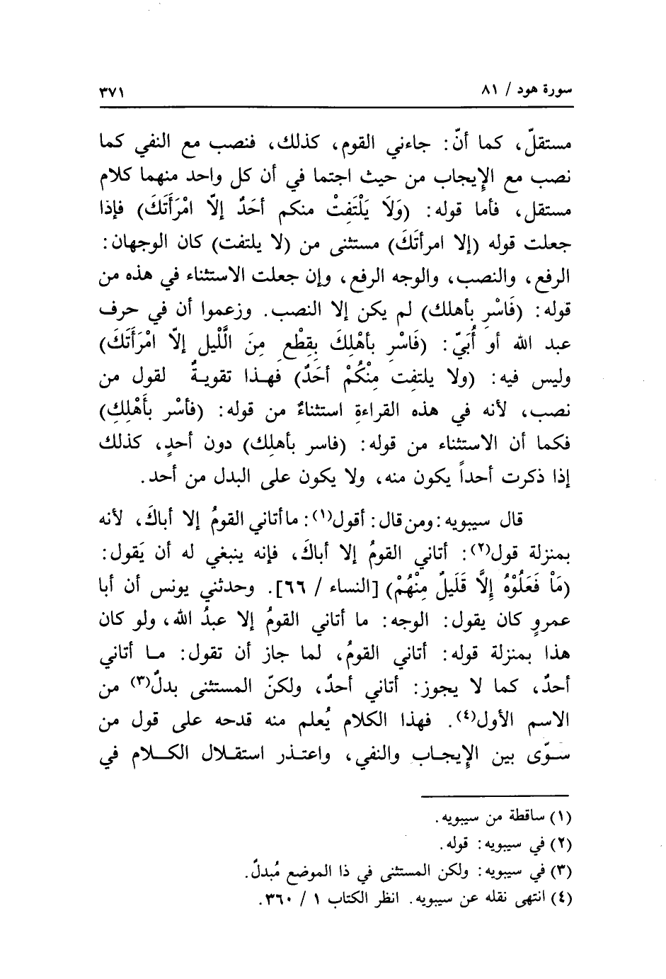 مستقلّ، كما أنّ: جاءني القوم، كذلك، فنصب مع النفي كما نصب مع الإيجاب من حيث اجتمعا في أن كل واحد منهما كلام مستقل، فأما قوله: ولا يلتفت منكم أحد إلا امرأتك فإذا جعلت قوله إلا امرأتك مستثنى من لا يلتفت كان الوجهان: