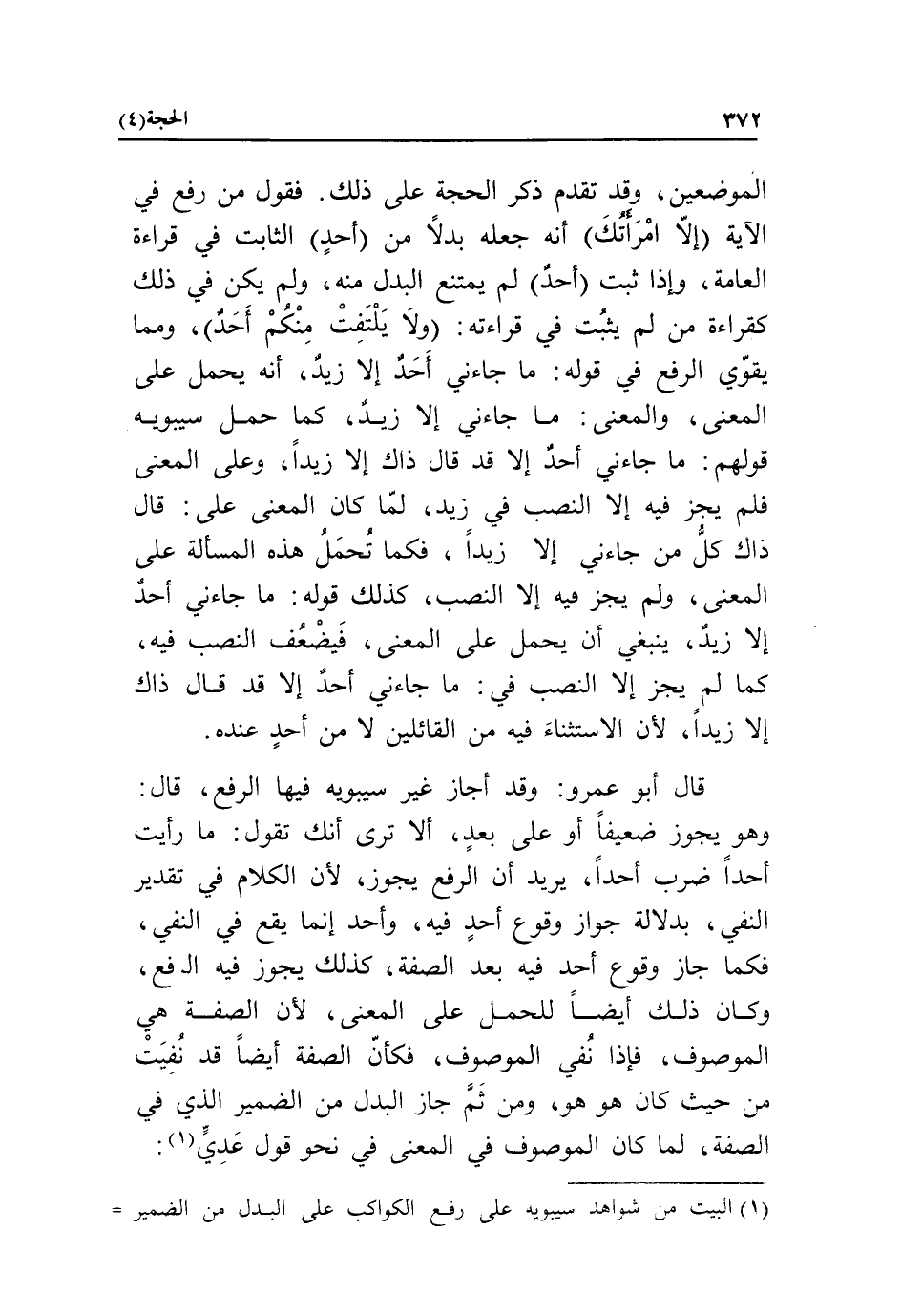 الموضعين، وقد تقدم ذكر الحجة على ذلك. فقول من رفع في الآية إلا امرأتك* أنه جعله بدلا من أحد* الثابت في قراءة العامة، وإذا ثبت أحد* لم يمتنع البدل منه، ولم يكن في ذلك كقراءة من لم يثبت في قراءته: ولا يلتفت منكم أحد، ومما يقوّي الرفع في قوله: ما جاءني أحد إلا زيد، أنه يحمل على المعنى، والمعنى: ما جاءني إلا زيد، كما حمل سيبويه قولهم: ما جاءني أحد إلا قد قال ذاك إلا زيدا، وعلى المعنى فلم يجز فيه إلا النصب في زيد، لمّا كان المعنى على: قال ذاك كلّ من جاءني إلا زيدا، فكما تحمل هذه المسألة على المعنى، ولم يجز فيه إلا النصب، كذلك قوله: ما جاءني أحد إلا زيد، ينبغي أن يحمل على المعنى، فيضعف النصب فيه، كما لم يجز إلا النصب في: ما جاءني أحد إلا قد قال ذاك إلا زيدا، لأن الاستثناء فيه من القائلين لا من أحد عنده.