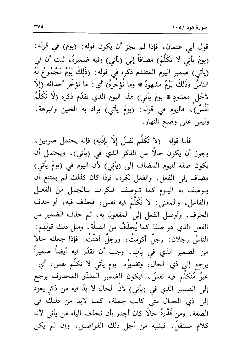 فأما قوله: لا تكلم نفس إلا بإذنه فإنه يحتمل ضربين، يجوز أن يكون حالا من الذكر الذي في يأتي*، ويحتمل أن يكون صفة لليوم المضاف إلى يأتي* لأن اليوم في يوم يأتي مضاف إلى الفعل، والفعل نكرة، فإذا كان كذلك لم يمتنع أن يوصف به اليوم كما توصف النكرات بالجمل من الفعل والفاعل، والمعنى: لا تكلّم فيه نفس، فحذف فيه، أو حذف الحرف، وأوصل الفعل إلى المفعول به، ثم حذف الضمير من الفعل الذي هو صفة كما يحذف من الصّلة، ومثل ذلك قولهم: