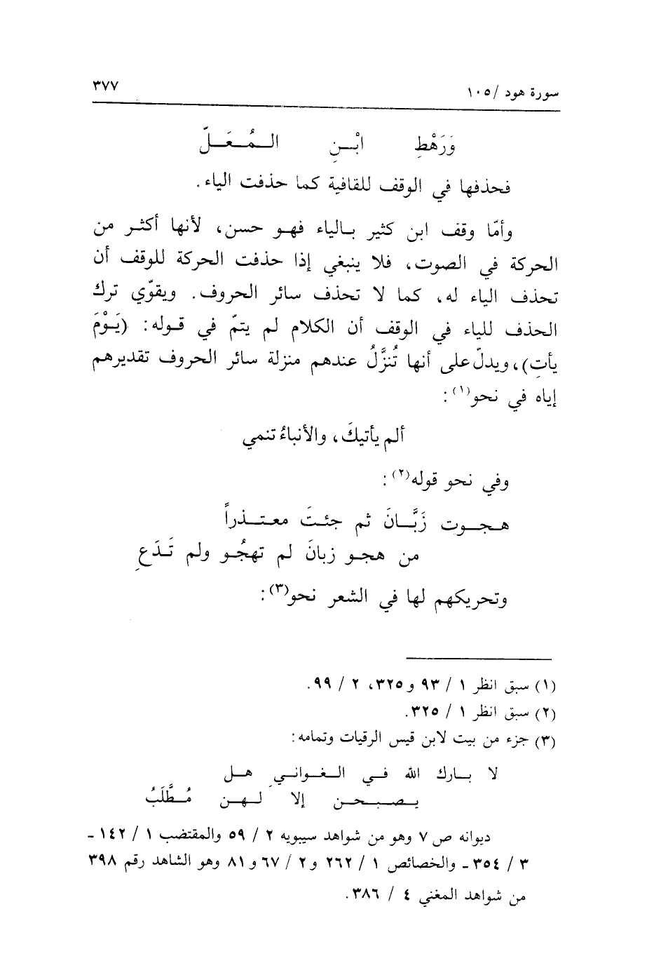 وأمّا وقف ابن كثير بالياء فهو حسن، لأنها أكثر من الحركة في الصوت، فلا ينبغي إذا حذفت الحركة للوقف أن تحذف الياء له، كما لا تحذف سائر الحروف. ويقوّي ترك الحذف للياء في الوقف أن الكلام لم يتمّ في قوله: يوم يأت، ويدلّ على أنها تنزّل عندهم منزلة سائر الحروف تقديرهم إياه في نحو «1»: