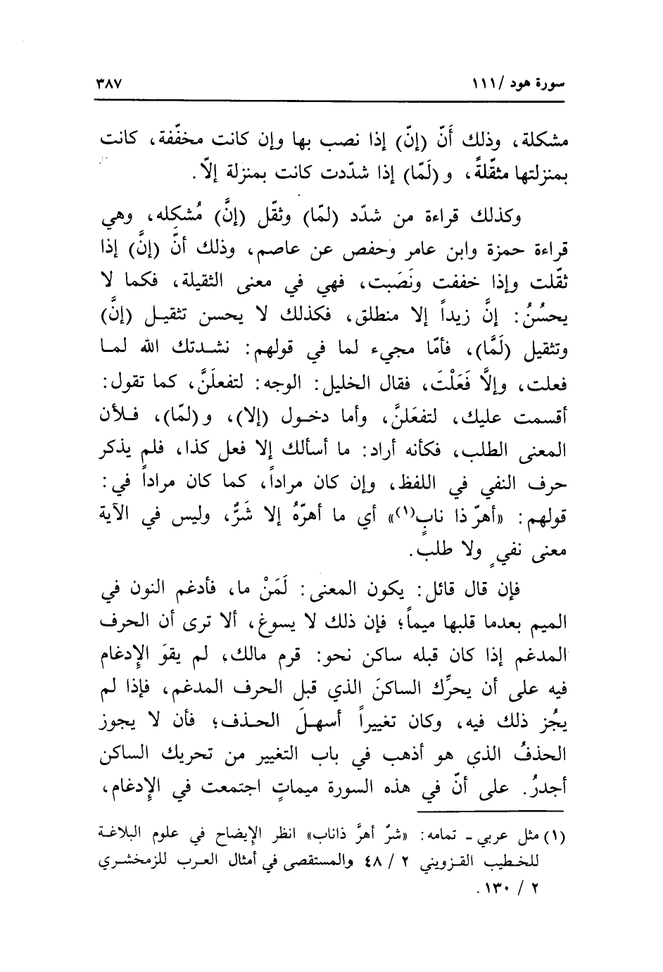 وكذلك قراءة من شدّد لما وثقّل إن مشكلة، وهي قراءة حمزة وابن عامر وحفص عن عاصم، وذلك أنّ إن إذا ثقّلت وإذا خففت ونصبت، فهي في معنى الثقيلة، فكما لا يحسن: إنّ زيدا إلا منطلق، فكذلك لا يحسن تثقيل إن وتثقيل لما، فأمّا مجيء لما في قولهم: نشدتك الله لما فعلت، وإلّا فعلت، فقال الخليل: الوجه: لتفعلنّ، كما تقول: