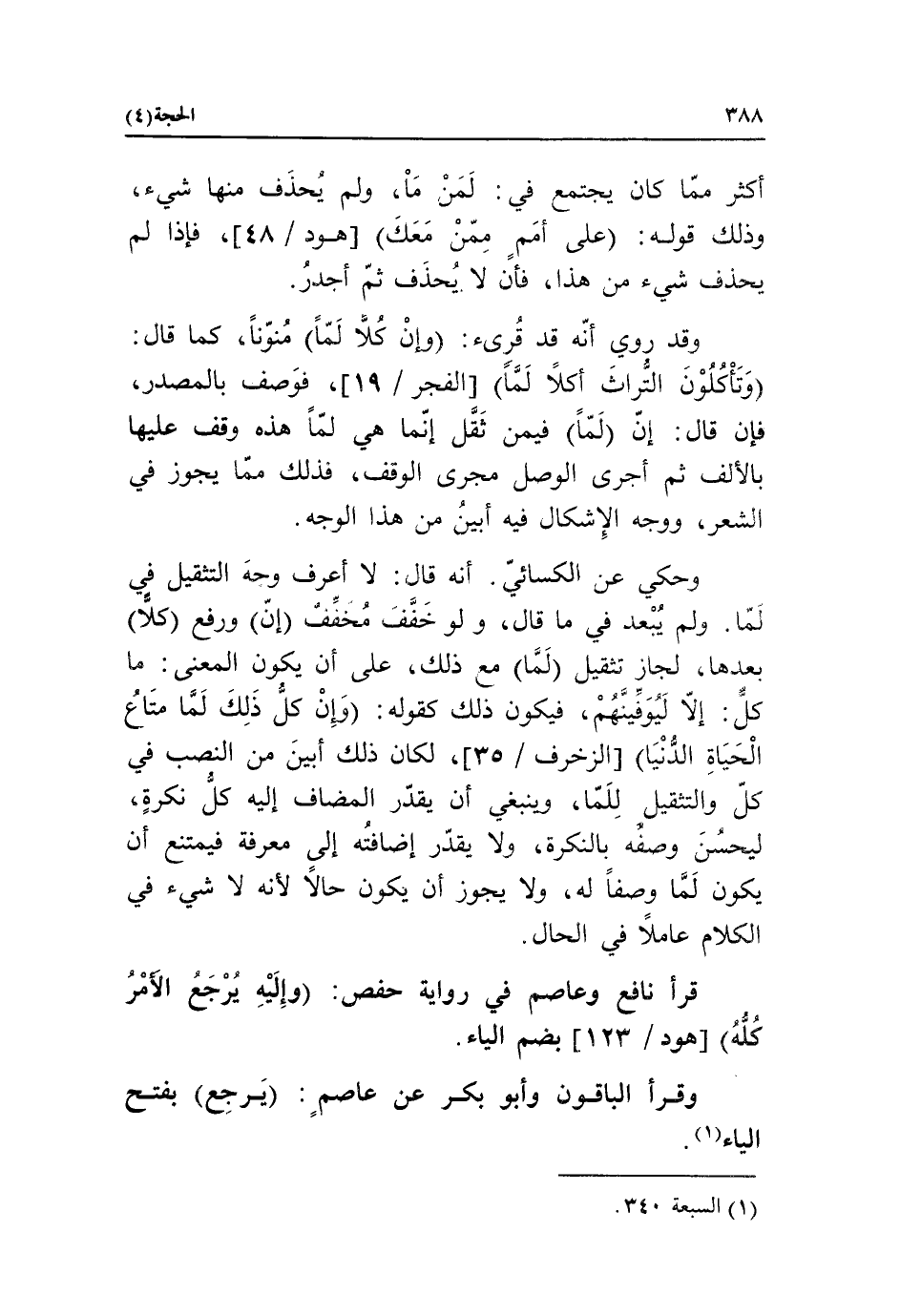 وحكي عن الكسائيّ. أنه قال: لا أعرف وجه التثقيل في لمّا. ولم يبعد في ما قال، ولو خفّف مخفّف إن* ورفع كلّا بعدها، لجاز تثقيل لما* مع ذلك، على أن يكون المعنى: ما كلّ: إلّا ليوفّينّهم، فيكون ذلك كقوله: وإن كل ذلك لما متاع الحياة الدنيا [الزخرف/ 35]، لكان ذلك أبين من النصب في كلّ والتثقيل للمّا، وينبغي أن يقدّر المضاف إليه كلّ نكرة، ليحسن وصفه بالنكرة، ولا يقدّر إضافته إلى معرفة فيمتنع أن يكون لمّا وصفا له، ولا يجوز أن يكون حالا لأنه لا شيء في الكلام عاملا في الحال.