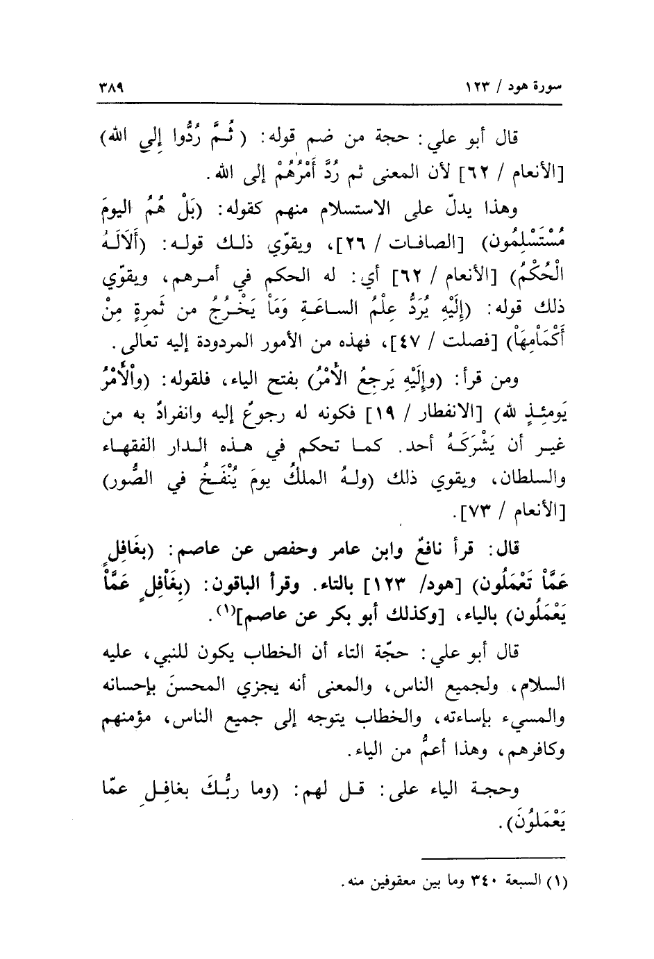 قال: قرأ نافع وابن عامر وحفص عن عاصم: بغافل عما تعملون [هود/ 123] بالتاء. وقرأ الباقون: بغافل عما يعملون* بالياء، [وكذلك أبو بكر عن عاصم] «1».