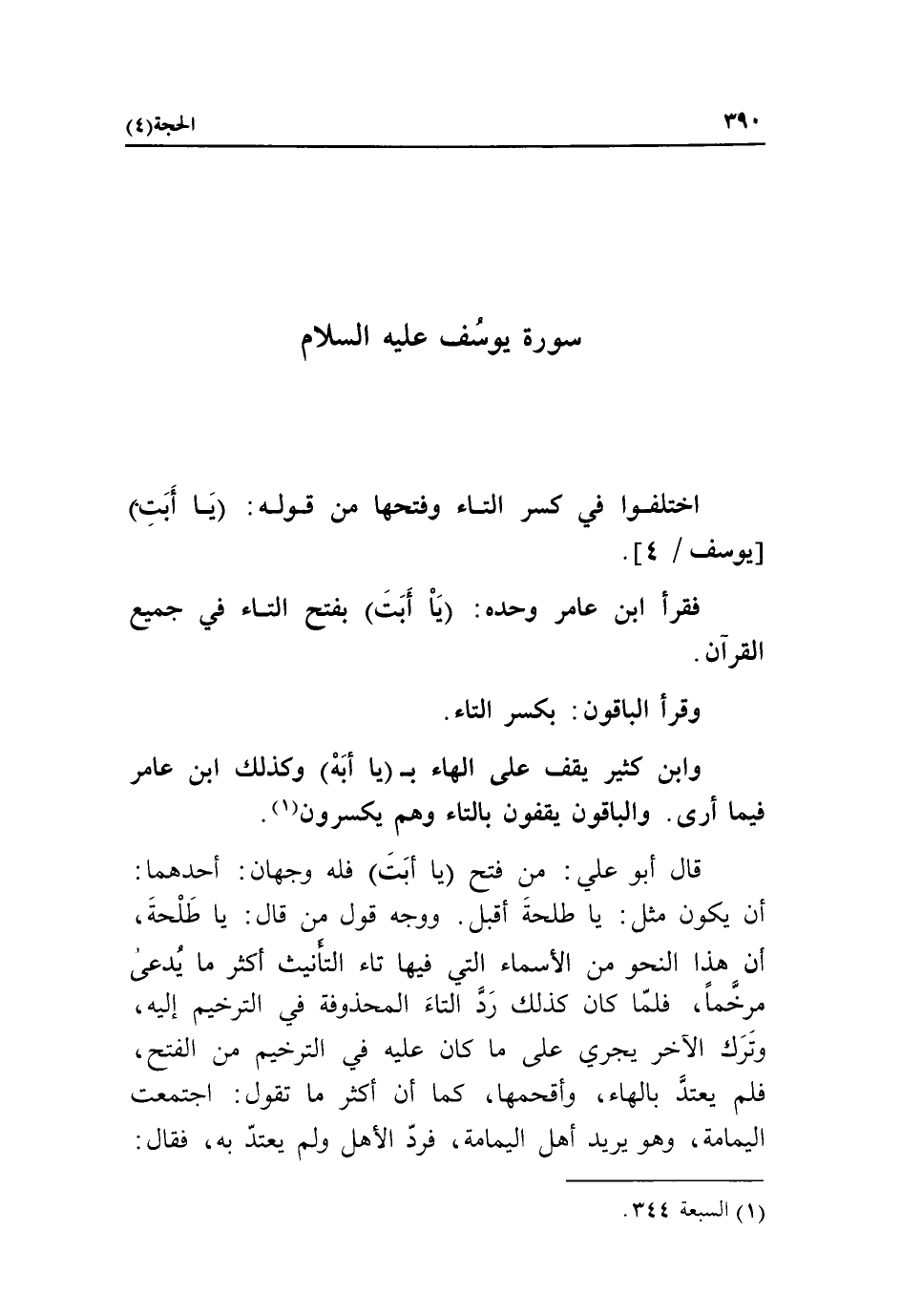 قال أبو علي: من فتح يا أبت* فله وجهان: أحدهما: