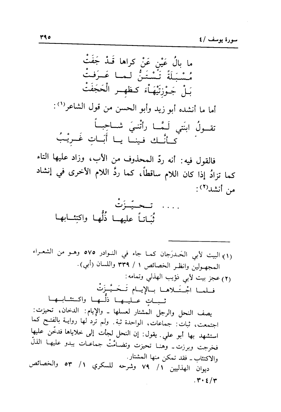ما بال عين عن كراها قد جفت مسبلة تستنّ لما عرفت بل جوز تيهاء كظهر الحجفت أما ما أنشده أبو زيد وأبو الحسن من قول الشاعر «1»: