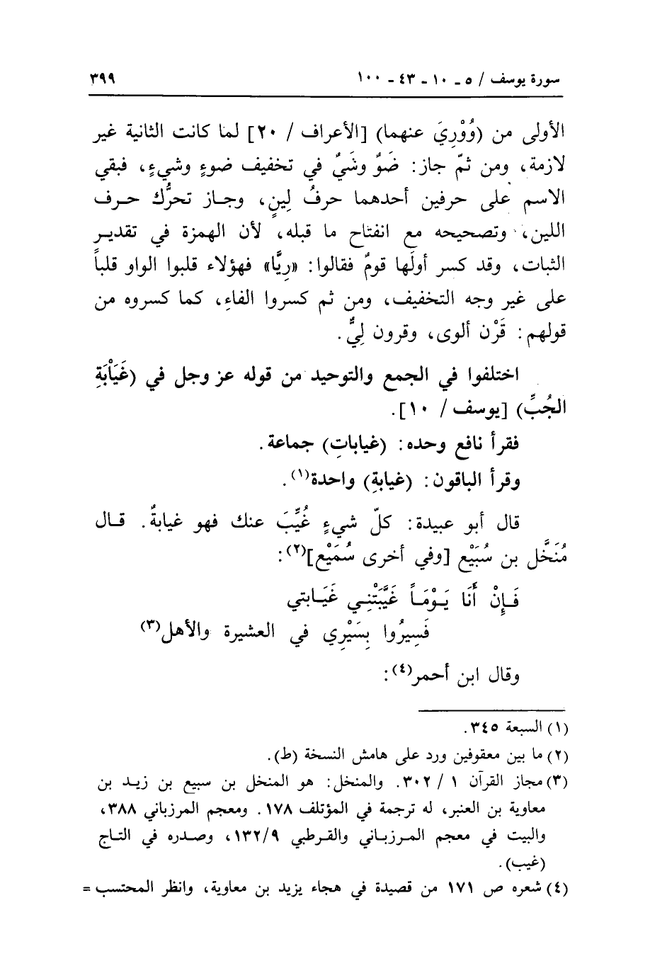(3) مجاز القرآن 1/ 302. والمنخل: هو المنخل بن سبيع بن زيد بن معاوية بن العنبر، له ترجمة في المؤتلف 178. ومعجم المرزباني 388، والبيت في معجم المرزباني والقرطبي 9/ 132، وصدره في التاج (غيب).