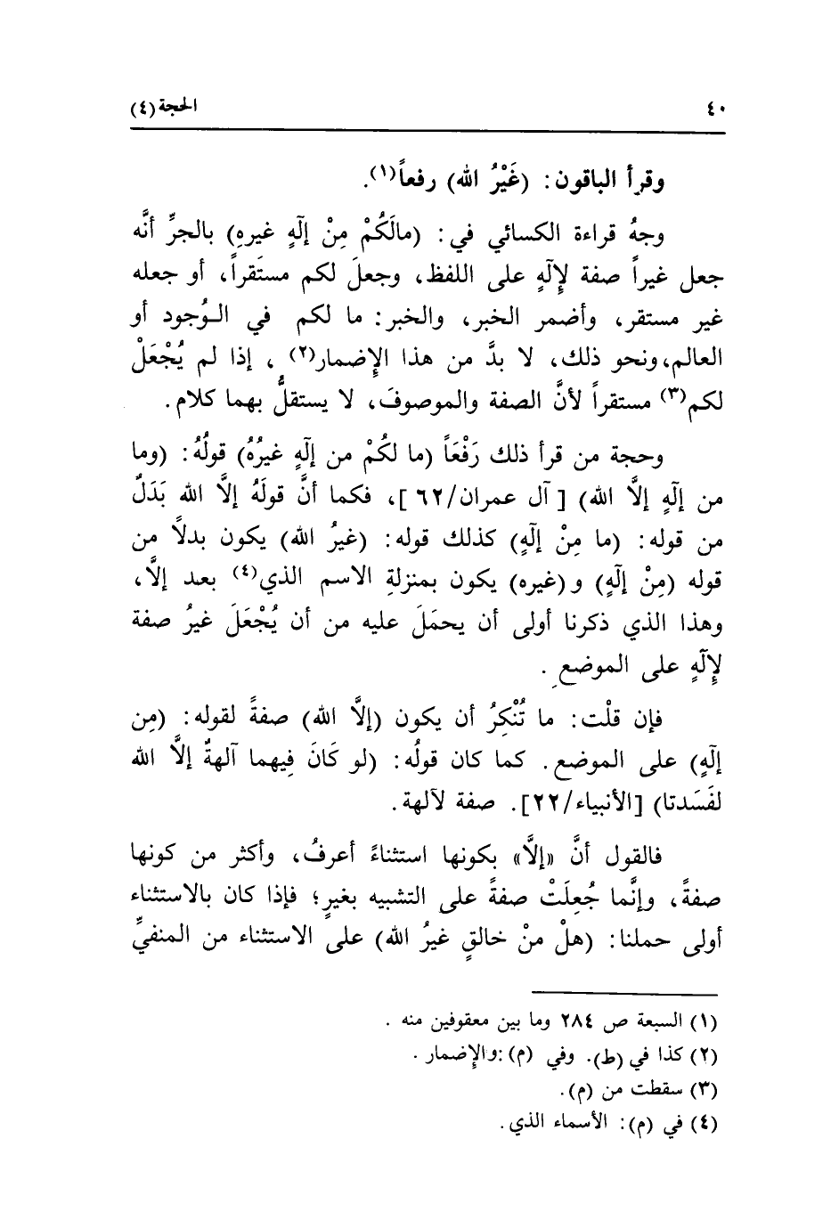 فالقول أنّ «إلّا» بكونها استثناء أعرف، وأكثر من كونها صفة، وإنّما جعلت صفة على التشبيه بغير؛ فإذا كان بالاستثناء أولى حملنا: هل من خالق غير الله على الاستثناء من المنفي