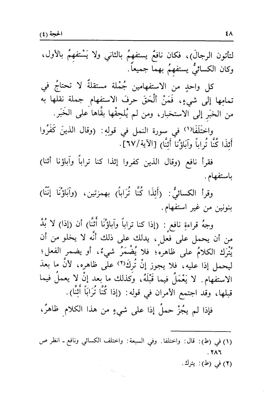 (1) في (ط): قال: واختلفا. وفي السبعة: واختلف الكسائي ونافع- انظر ص 286.