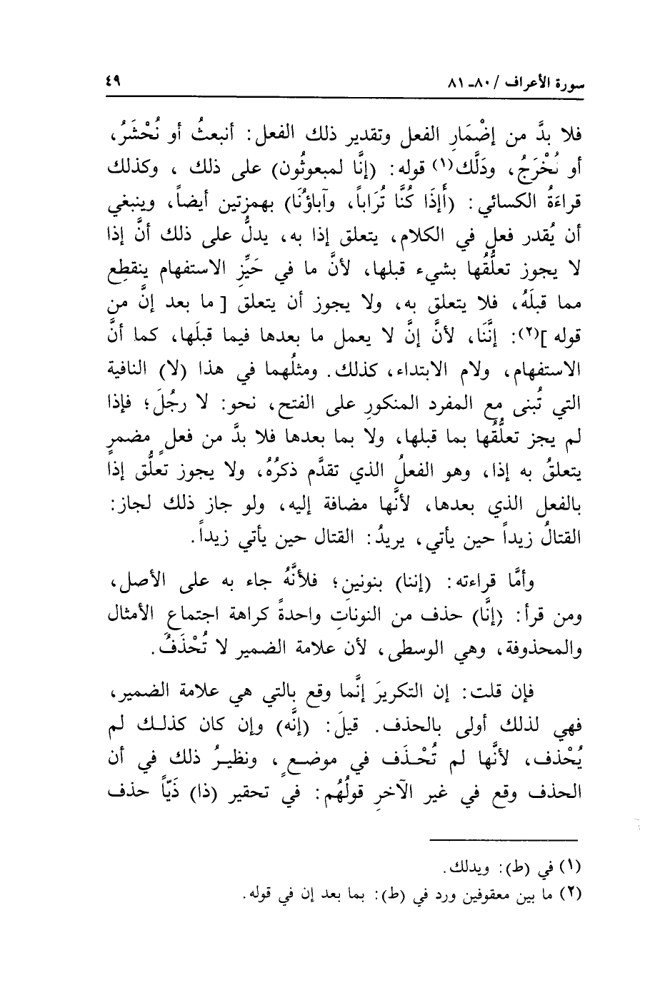 وأمّا قراءته: إننا* بنونين؛ فلأنّه جاء به على الأصل، ومن قرأ: إنا* حذف من النونات واحدة كراهة اجتماع الأمثال والمحذوفة، وهي الوسطى، لأن علامة الضمير لا تحذف.
