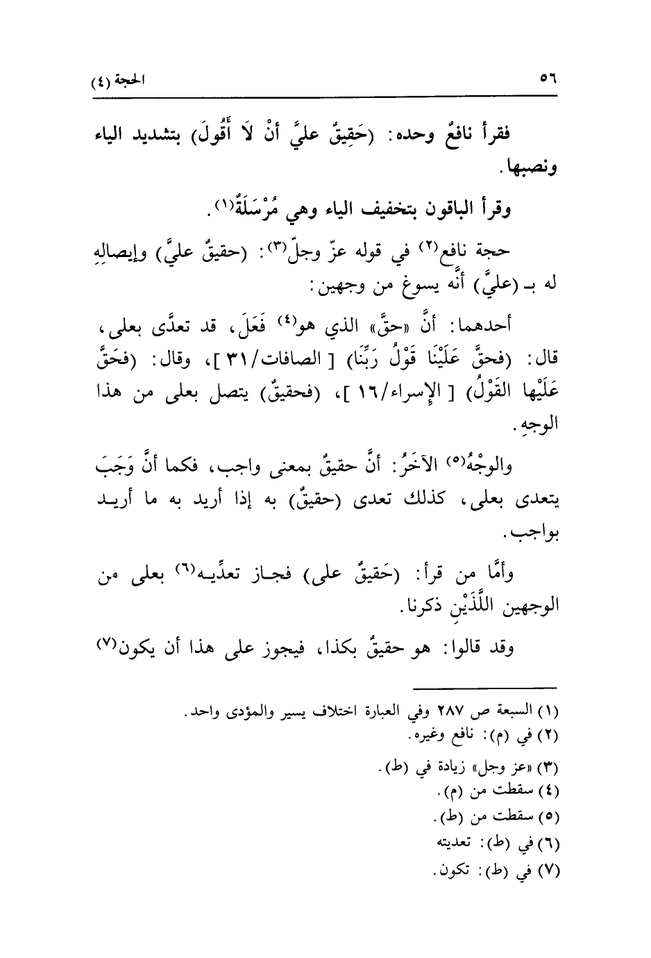 حجة نافع «2» في قوله عزّ وجلّ «3»: حقيق علي وإيصاله له بعلي* أنّه يسوغ من وجهين:
