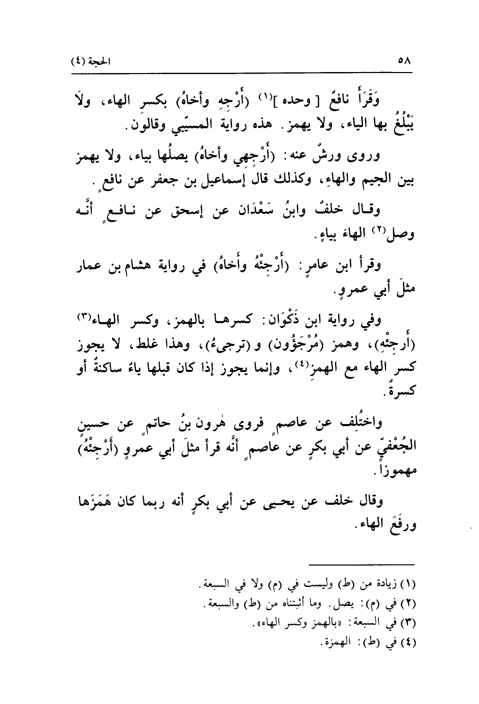 وفي رواية ابن ذكوان: كسرها بالهمز، وكسر الهاء «3» أرجئه، وهمز مرجئون وترجئ، وهذا غلط، لا يجوز كسر الهاء مع الهمز «4»، وإنما يجوز إذا كان قبلها ياء ساكنة أو كسرة.