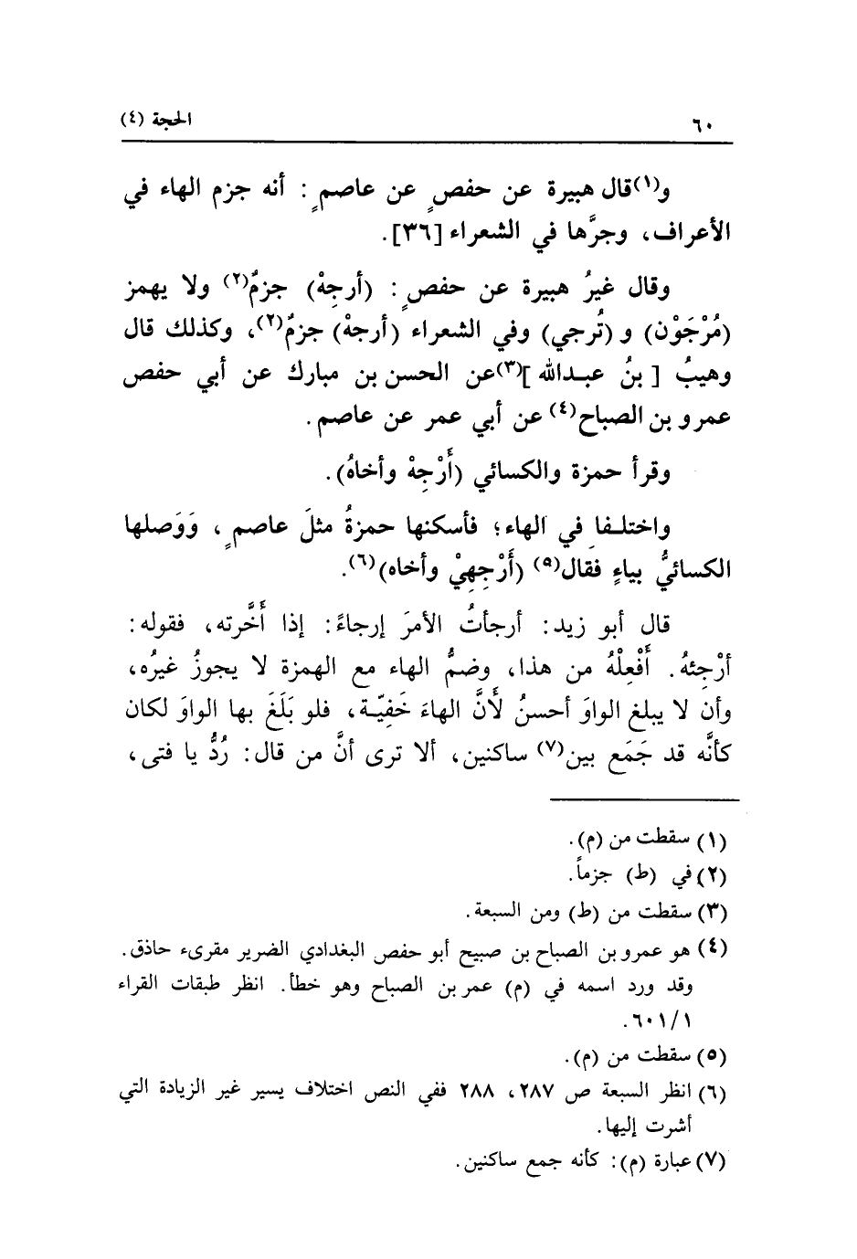 (7) انظر السبعة ص 287، 288 ففي النص اختلاف يسير غير الزيادة التي أشرت إليها.