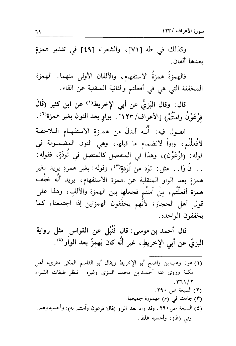 (4) السبعة ص 290. وقد زاد بعد الواو (قال فرعون وآمنتم به): وأحسبه وهم.