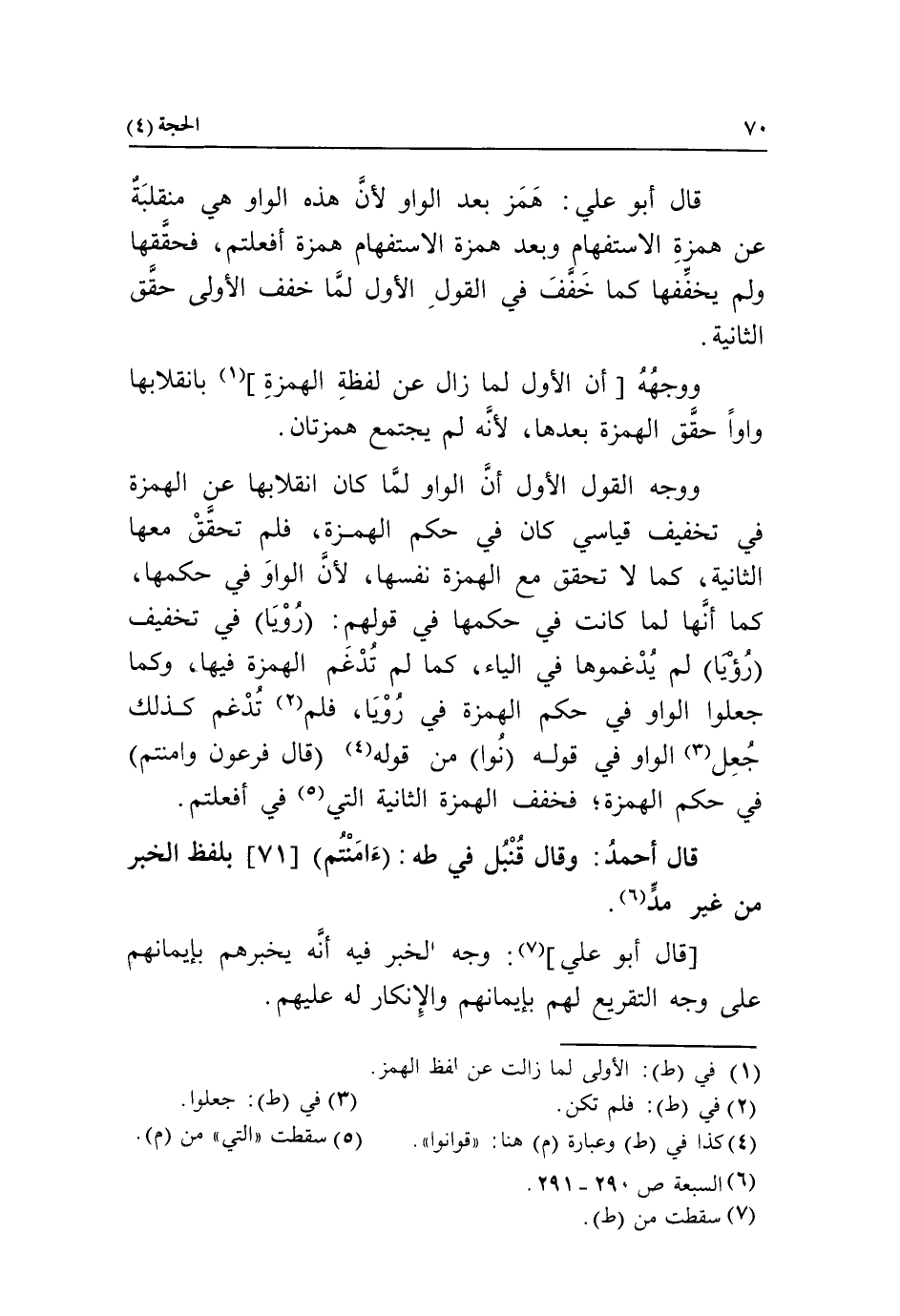 قال أبو علي: همز بعد الواو لأنّ هذه الواو هي منقلبة عن همزة الاستفهام وبعد همزة الاستفهام همزة أفعلتم، فحقّقها ولم يخفّفها كما خفّف في القول الأول لمّا خفف الأولى حقّق الثانية.