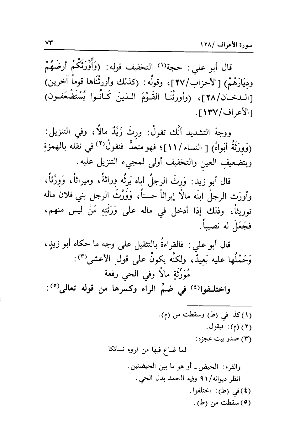 قال أبو علي: حجة «1» التخفيف قوله: وأورثكم أرضهم وديارهم [الأحزاب/ 27]، وقوله: كذلك وأورثناها قوما آخرين [الدخان/ 28]، وأورثنا القوم الذين كانوا يستضعفون [الأعراف/ 137].