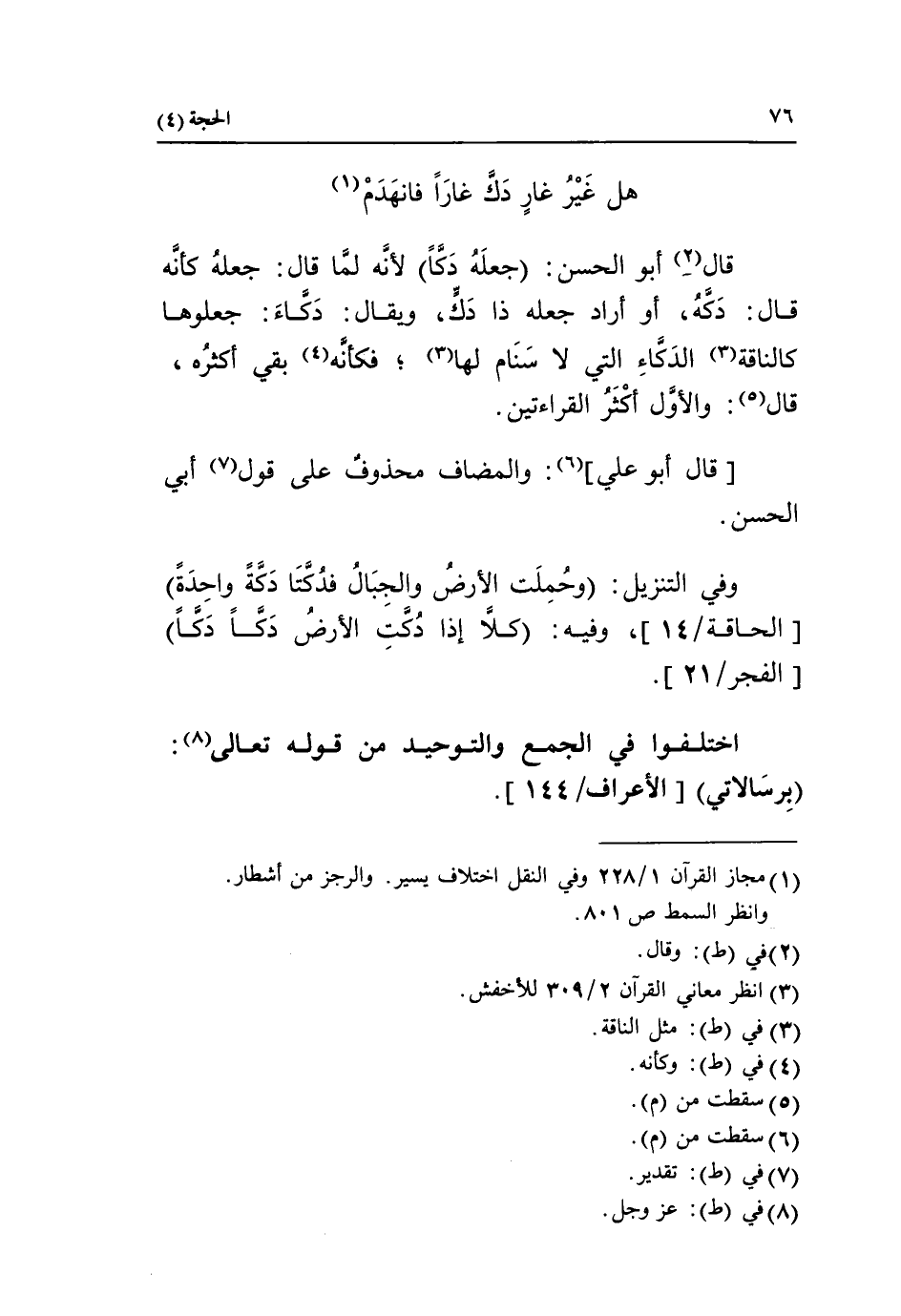 هل غير غار دكّ غارا فانهدم «1» قال «2» أبو الحسن: جعله دكا لأنّه لمّا قال: جعله كأنّه قال: دكّه، أو أراد جعله ذا دكّ، ويقال: دكّاء: جعلوها كالناقة «3» الدكّاء التي لا سنام لها «4»؛ فكأنّه «5» بقي أكثره، قال «6»: والأوّل أكثر القراءتين.