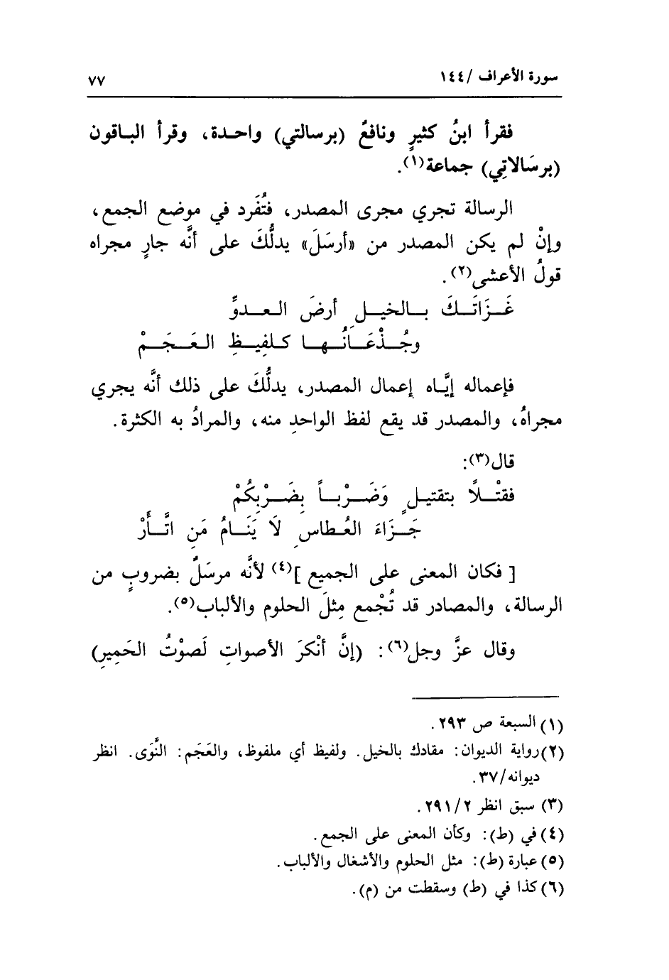فقتلا بتقتيل وضربا بضربكم* جزاء العطاس لا ينام من اتّأر [فكان المعنى على الجميع] «4» لأنّه مرسل بضروب من الرسالة، والمصادر قد تجمع مثل الحلوم والألباب «5».