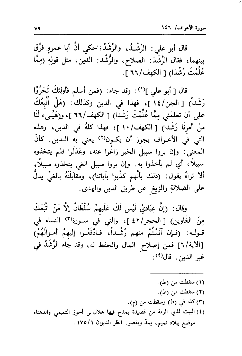وقال: إن عبادي ليس لك عليهم سلطان إلا من اتبعك من الغاوين [الحجر/ 42]، والتي في سورة «3» النساء في قوله: فإن آنستم منهم رشدا، فادفعوا إليهم أموالهم [الآية/ 6] فمن إصلاح المال والحفظ له، وقد جاء الرّشد في غير الدين. قال «4»: