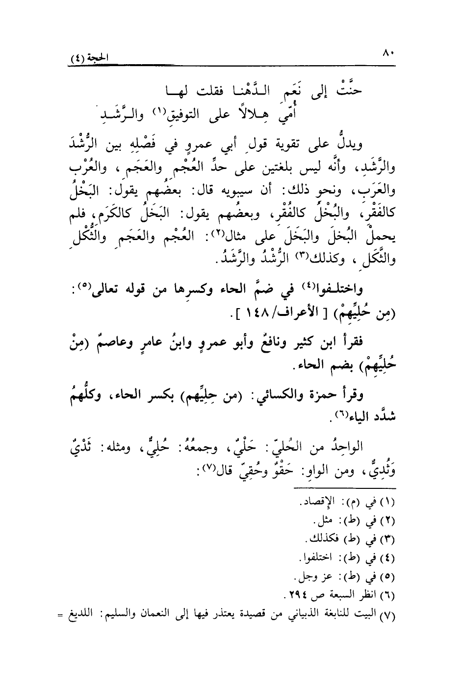 «1» والرّشد ويدلّ على تقوية قول أبي عمرو في فصله بين الرّشد والرّشد، وأنّه ليس بلغتين على حدّ العجم والعجم، والعرب والعرب، ونحو ذلك: أن سيبويه قال: بعضهم يقول: البخل كالفقر، والبخل كالفقر، وبعضهم يقول: البخل كالكرم، فلم يحمل البخل والبخل على مثال «2»: العجم والعجم والثّكل والثّكل، وكذلك «3» الرّشد والرّشد.