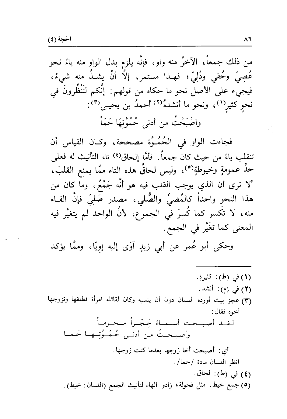 وأصبحت من أدنى حموّتها حما فجاءت الواو في الحموّة مصححة، وكان القياس أن تنقلب ياء من حيث كان جمعا. فأمّا إلحاق «4» تاء التأنيث له فعلى حدّ عمومة وخيوطة «5»، وليس لحاق هذه التاء ممّا يمنع القلب، ألا ترى أن الذي يوجب القلب فيه هو أنّه جمع، وما كان من هذا النحو واحدا كالمضيّ والصّلي، مصدر صلي فإنّ الفاء منه، لا تكسر كما كسر في الجموع، لأنّ الواحد لم يتغيّر فيه المعنى كما تغيّر في الجمع.