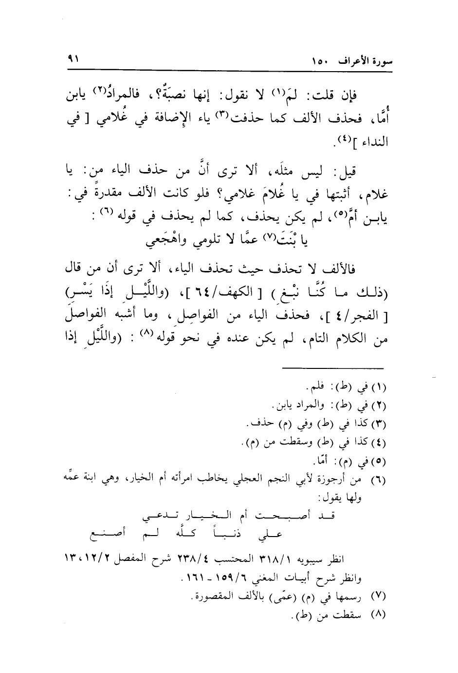 يا بنت «7» عمّا لا تلومي واهجعي فالألف لا تحذف حيث تحذف الياء، ألا ترى أن من قال ذلك ما كنا نبغ [الكهف/ 64]، والليل إذا يسر [الفجر/ 4]، فحذف الياء من الفواصل، وما أشبه الفواصل من الكلام التام، لم يكن عنده في نحو قوله «8»: والليل إذا