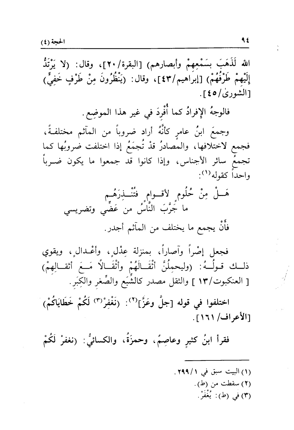 وجمع ابن عامر كأنّه أراد ضروبا من المآثم مختلفة، فجمع لاختلافها، والمصادر قد تجمع إذا اختلفت ضروبها كما تجمع سائر الأجناس، وإذا كانوا قد جمعوا ما يكون ضربا واحدا كقوله «1»: