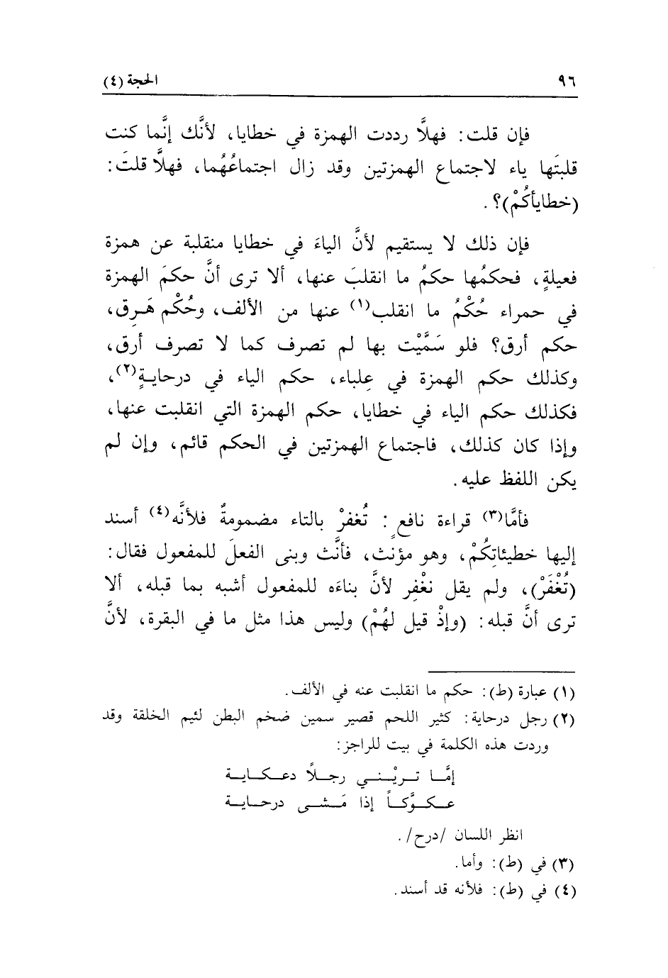 فإن ذلك لا يستقيم لأنّ الياء في خطايا منقلبة عن همزة فعيلة، فحكمها حكم ما انقلب عنها، ألا ترى أنّ حكم الهمزة في حمراء حكم ما انقلب «1» عنها من الألف، وحكم هرق، حكم أرق؟ فلو سمّيت بها لم تصرف كما لا تصرف أرق، وكذلك حكم الهمزة في علباء، حكم الياء في درحاية «2»، فكذلك حكم الياء في خطايا، حكم الهمزة التي انقلبت عنها، وإذا كان كذلك، فاجتماع الهمزتين في الحكم قائم، وإن لم يكن اللفظ عليه.