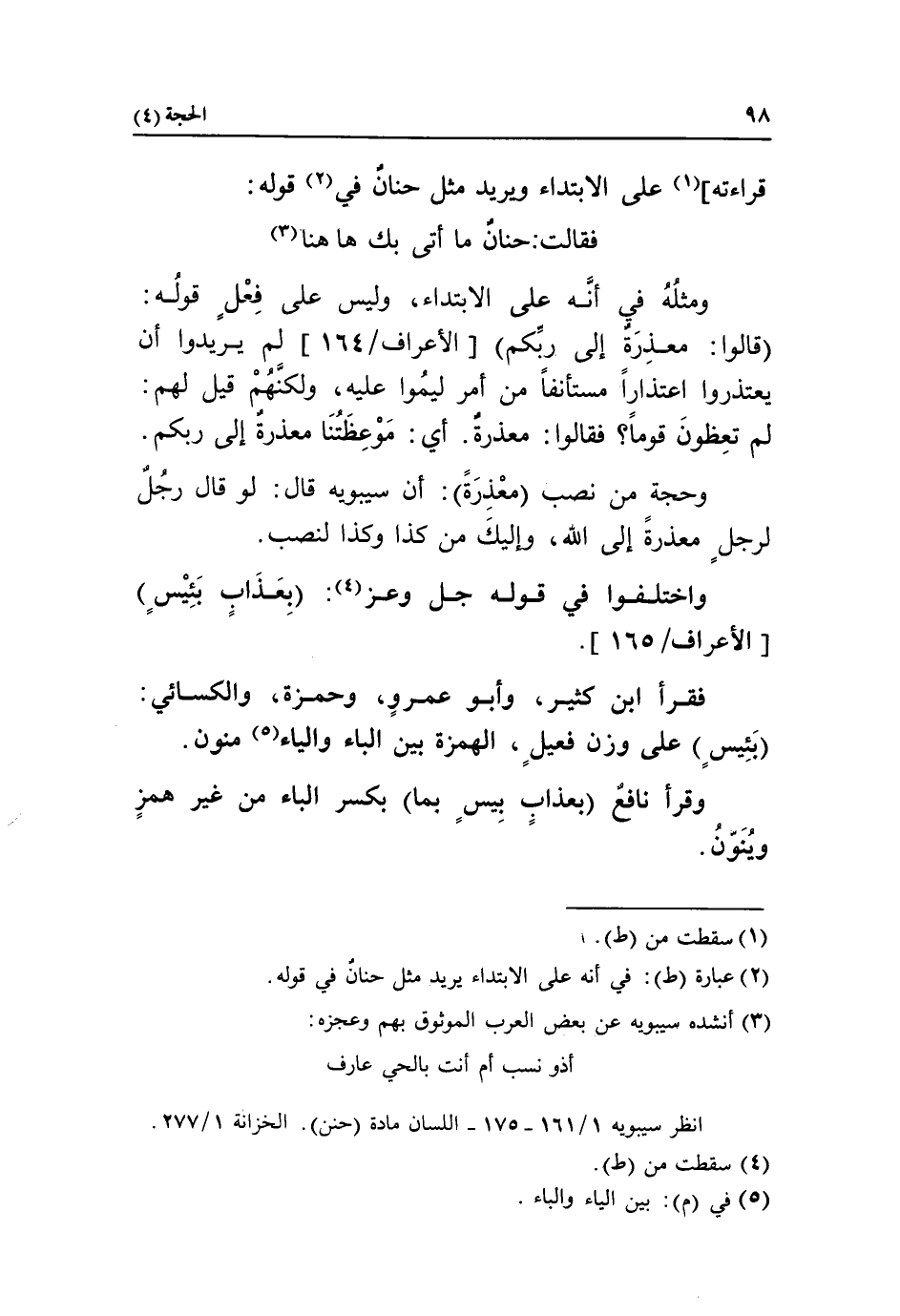 وحجة من نصب معذرة: أن سيبويه قال: لو قال رجل لرجل معذرة إلى الله، وإليك من كذا وكذا لنصب.