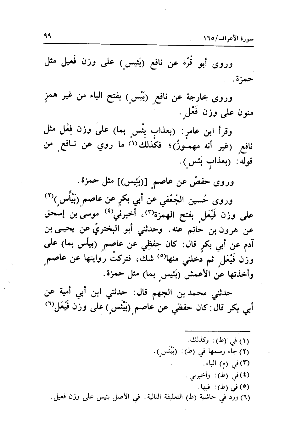وروى حسين الجعفي عن أبي بكر عن عاصم بيأس «2» على وزن فيعل بفتح الهمزة «3»، أخبرني «4» موسى بن إسحاق عن هارون بن حاتم عنه. وحدثني أبو البختريّ عن يحيى بن آدم عن أبي بكر قال: كان حفظي عن عاصم بيأس بما على وزن فيعل ثم دخلني منها «5» شك، فتركت روايتها عن عاصم وأخذتها عن الأعمش بئيس بما مثل حمزة.