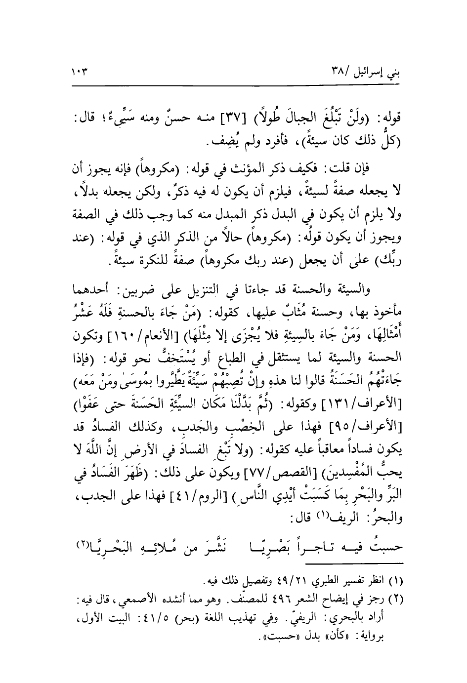 فإن قلت: فكيف ذكر المؤنث في قوله: مكروها فإنه يجوز أن لا يجعله صفة لسيئة، فيلزم أن يكون له فيه ذكر، ولكن يجعله بدلا، ولا يلزم أن يكون في البدل ذكر المبدل منه كما وجب ذلك في الصفة ويجوز أن يكون قوله: مكروها حالا من الذكر الذي في قوله: عند ربك على أن يجعل عند ربك مكروها صفة للنكرة سيئة.