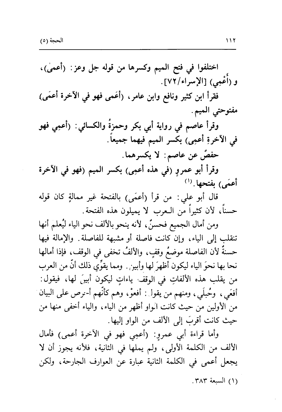 وأما قراءة أبي عمرو: (أعمى فهو في الآخرة أعمى) فأمال الألف من الكلمة الأولى، ولم يملها في الثانية، فلأنه يجوز أن لا يجعل أعمى في الكلمة الثانية عبارة عن العوارف الجارحة، ولكن