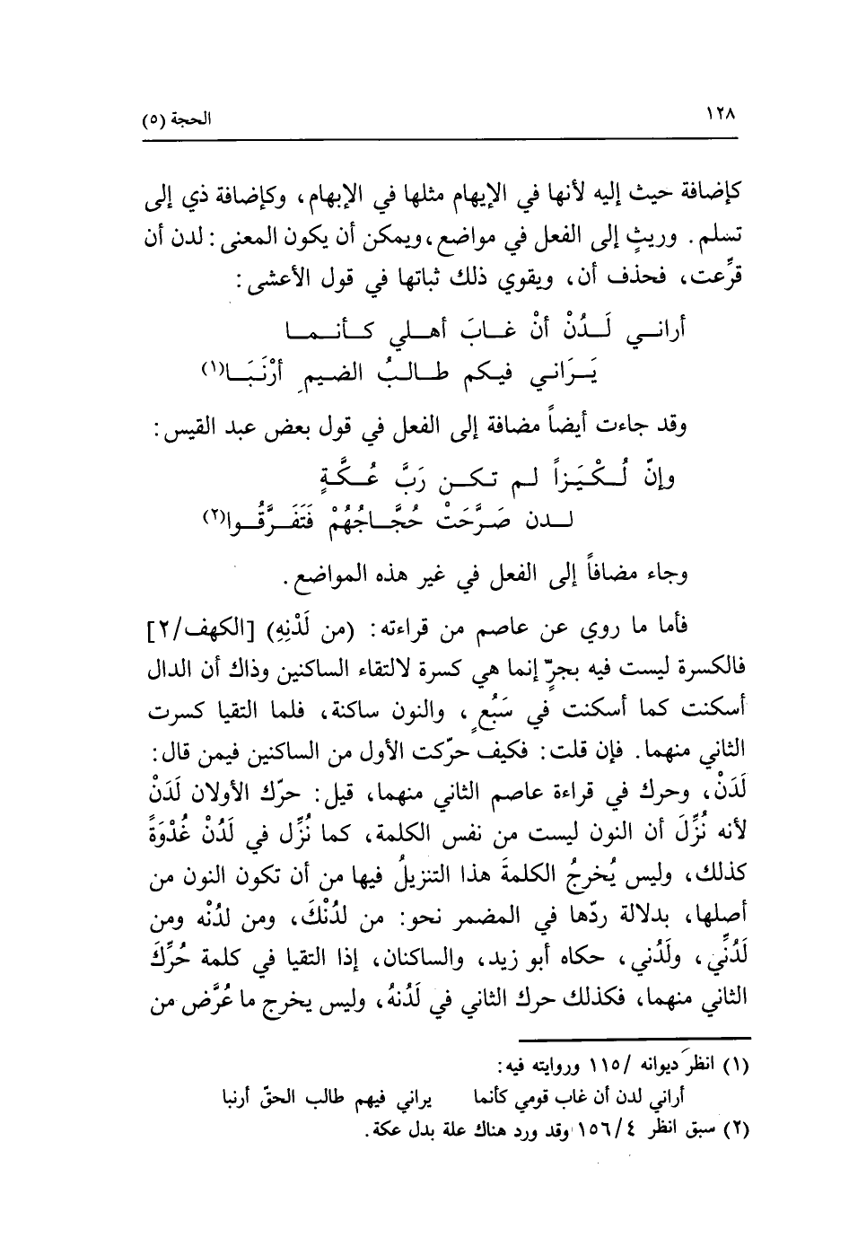 لدن، وحرك في قراءة عاصم الثاني منهما، قيل: حرّك الأولان لدن لأنه نزّل أن النون ليست من نفس الكلمة، كما نزّل في لدن غدوة كذلك، وليس يخرج الكلمة هذا التنزيل فيها من أن تكون النون من أصلها، بدلالة ردّها في المضمر نحو: من لدنك، ومن لدنه ومن لدنّي، ولدني، حكاه أبو زيد، والساكنان، إذا التقيا في كلمة حرّك الثاني منهما، فكذلك حرك الثاني في لدنه، وليس يخرج ما عرّض من