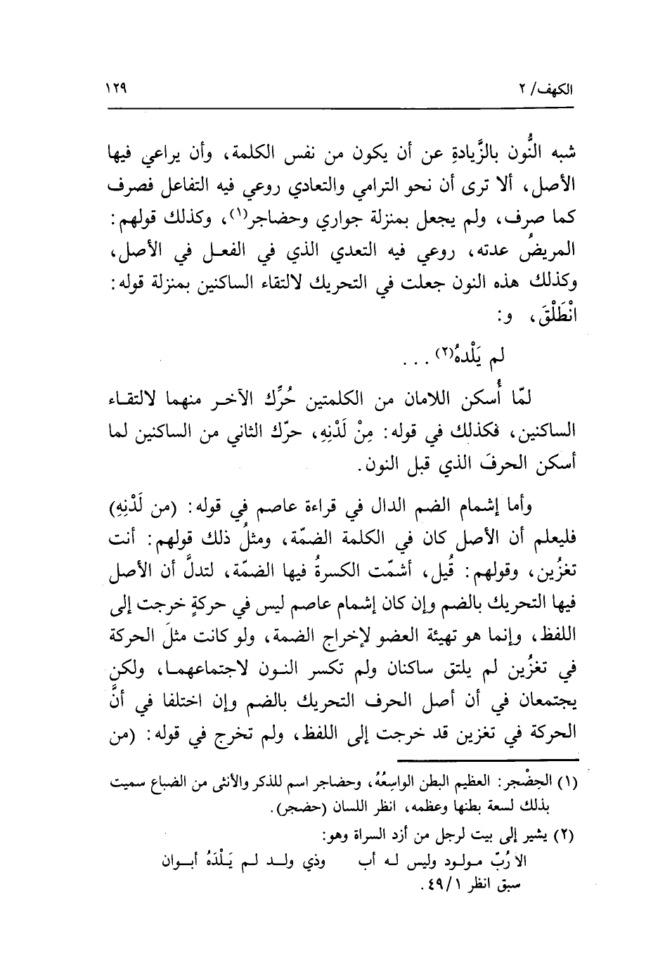 وأما إشمام الضم الدال في قراءة عاصم في قوله: (من لدنه) فليعلم أن الأصل كان في الكلمة الضمّة، ومثل ذلك قولهم: أنت تغزين، وقولهم: قيل، أشمّت الكسرة فيها الضمّة، لتدلّ أن الأصل فيها التحريك بالضم وإن كان إشمام عاصم ليس في حركة خرجت إلى اللفظ، وإنّما هو تهيئة العضو لإخراج الضمة، ولو كانت مثل الحركة في تغزين لم يلتق ساكنان ولم تكسر النون لاجتماعهما، ولكن يجتمعان في أن أصل الحرف التحريك بالضم وإن اختلفا في أنّ الحركة في تغزين قد خرجت إلى اللفظ، ولم تخرج في قوله: (من