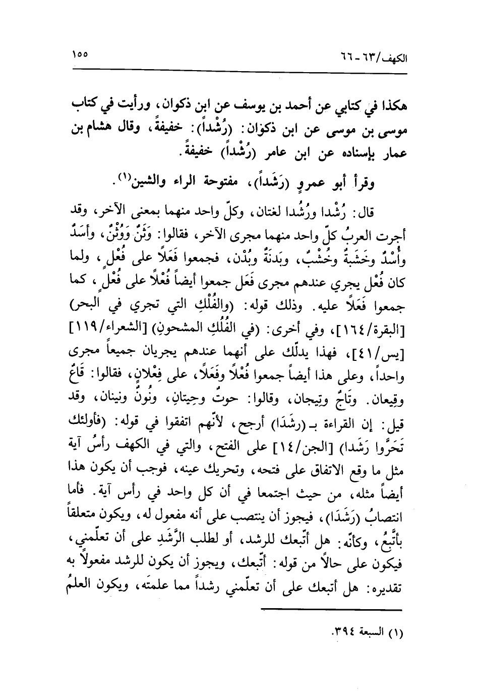 قال: رشدا ورشدا لغتان، وكلّ واحد منهما بمعنى الآخر، وقد أجرت العرب كلّ واحد منهما مجرى الآخر، فقالوا: وثن ووثن، وأسد وأسد وخشبة وخشب، وبدنة وبدن، فجمعوا فعلا على فعل، ولما كان فُعل يجري عندهم مجرى فعل جمعوا أيضا فُعلا على فُعل، كما جمعوا فعلا عليه. وذلك قوله: والفلك التي تجري في البحر [البقرة/ 164]، وفي أخرى: في الفلك المشحون [الشعراء/ 119] [يس/ 41]، فهذا يدلّك على أنهما عندهم يجريان جميعا مجرى واحدا، وعلى هذا أيضا جمعوا فُعلا وفَعَلا، على فعلانٍ، فقالوا: قاعٌ وقيعان. وتاج وتيجان، وقالوا: حوت وحيتان، ونون ونينان، وقد قيل: إن القراءة ب رشدا أرجح، لأنهم اتفقوا في قوله: فأولئك تحروا رشدا [الجن/ 14] على الفتح، والتي في الكهف رأس آية مثل ما وقع الاتفاق على فتحه، وتحريك عينه، فوجب أن يكون هذا أيضا مثله، من حيث اجتمعا في أن كل واحد في رأس آية. فأما انتصاب رشدا، فيجوز أن ينتصب على أنه مفعول له، ويكون متعلقا بأتّبع، وكأنّه: هل أتّبعك للرشد، أو لطلب الرّشد على أن تعلمني، فيكون على حالا من قوله: أتبعك، ويجوز أن يكون للرشد مفعولا به تقديره: هل أتبعك على أن تعلّمني رشدا مما علمته، ويكون العلم