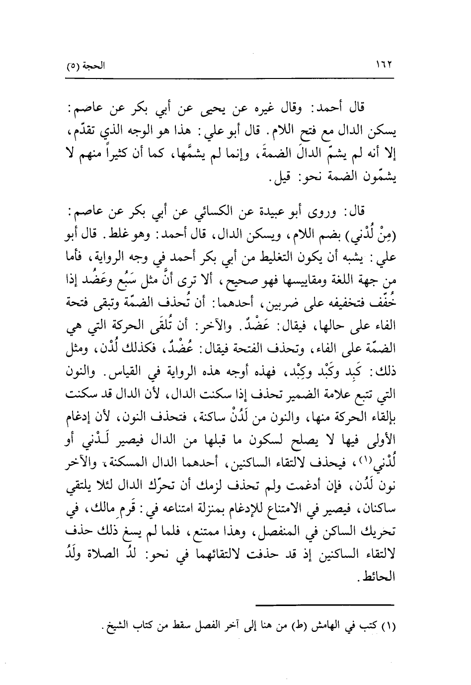 (من لدني) بضم اللام، ويسكن الدال، قال أحمد: وهو غلط. قال أبو علي: يشبه أن يكون التغليط من أبي بكر أحمد في وجه الرواية، فأما من جهة اللغة ومقاييسها فهو صحيح، ألا ترى أنّ مثل سبع وعضد إذا خفف فتخفيفه على ضربين، أحدهما: أن تحذف الضمة وتبقى فتحة الفاء على حالها، فيقال: عضد. والآخر: أن تلقى الحركة التي هي الضمّة على الفاء، وتحذف الفتحة فيقال: عضد، فكذلك لدن، ومثل ذلك: كبد وكبد وكبد، فهذه أوجه هذه الرواية في القياس. والنون التي تتبع علامة الضمير تحذف إذا سكنت الدال، لأن الدال قد سكنت بإلقاء الحركة منها، والنون من لدن ساكنة، فتحذف النون، لأن إدغام الأولى فيها لا يصلح لسكون ما قبلها من الدال فيصير لدني أو لدني «1»، فيحذف لالتقاء الساكنين، أحدهما الدال المسكنة، والآخر نون لدن، فإن أدغمت ولم تحذف لزمك أن تحرّك الدال لئلا يلتقي ساكنان، فيصير في الامتناع للإدغام بمنزلة امتناعه في: قرم مالك، في تحريك الساكن في المنفصل، وهذا ممتنع، فلما لم يسغ ذلك حذف لالتقاء الساكنين إذ قد حذفت لالتقائهما في نحو: لد الصلاة ولد الحائط.