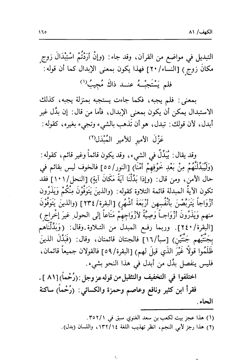 وليبدلنهم من بعد خوفهم أمنا [النور/ 55] فالخوف ليس بقائم في حال الأمن، ومن قال: وإذا بدلنا آية مكان آية [النحل/ 101] فقد تكون الآية المبدلة قائمة التلاوة كقوله: والذين يتوفون منكم ويذرون أزواجا يتربصن بأنفسهن أربعة أشهر [البقرة/ 234] والذين يتوفون منهم ويذرون أزواجا وصية لأزواجهم متاعا إلى الحول غير إخراج [البقرة/ 240]. وربما رفع المبدل من التلاوة. وقال: وبدلناهم بجنتيهم جنتين [سبأ/ 16] فالجنتان قائمتان، وقال: فبدل الذين ظلموا قولا غير الذي قيل لهم [البقرة/ 59] فالقولان جميعا قائمان، فليس ينفصل بدّل من أبدل في هذا النحو بشيء.