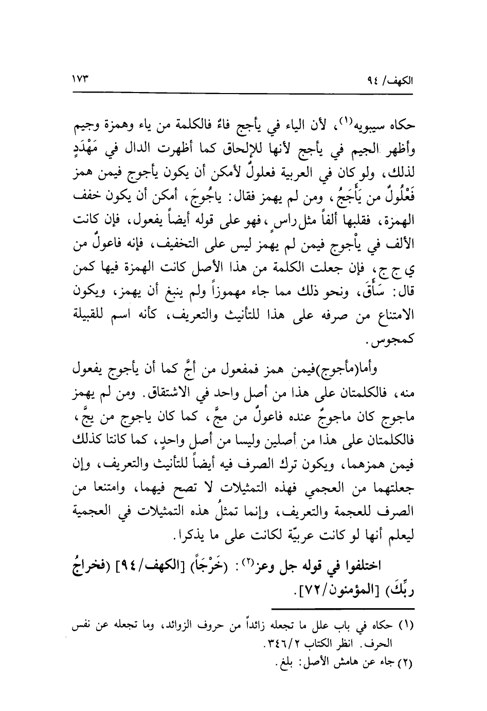 (1) حكاه في باب علل ما تجعله زائدا من حروف الزوائد، وما تجعله عن نفس الحرف. انظر الكتاب 2/ 346.