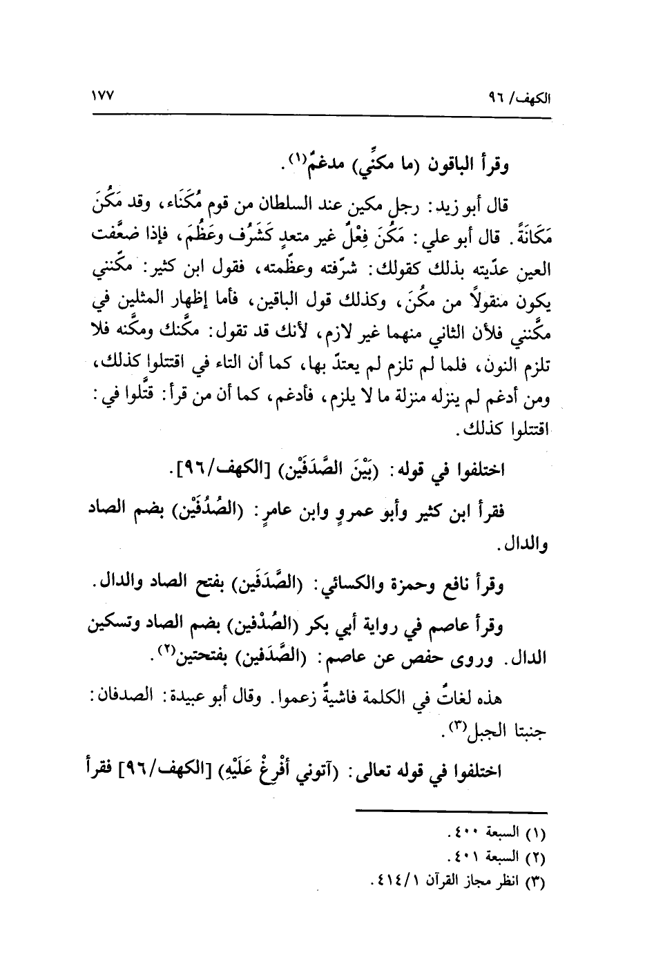 وقرأ عاصم في رواية أبي بكر (الصدفين) بضم الصاد وتسكين الدال. وروى حفص عن عاصم: الصدفين بفتحتين «2».