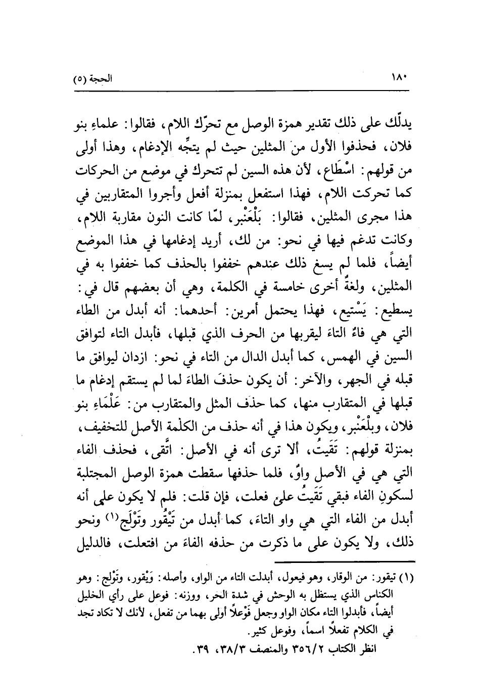 يدلّك على ذلك تقدير همزة الوصل مع تحرّك اللام، فقالوا: علماء بنو فلان، فحذفوا الأول من المثلين حيث لم يتجه الإدغام، وهذا أولى من قولهم، اسطاع، لأن هذه السين لم تتحرك في موضع من الحركات كما تحركت اللام، فهذا استفعل بمنزلة أفعل وأجروا المتقاربين في هذا مجرى المثلين، فقالوا: بلعنبر، لما كانت النون مقاربة اللام، وكانت تدغم فيها في نحو: من لك، أريد إدغامها في هذا الموضع أيضا، فلما لم يسغ ذلك عندهم خففوا بالحذف كما خففوا به في المثلين، ولغة أخرى خامسة في الكلمة، وهي أن بعضهم قال في: